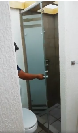 • Herrajes: Dos bisagras cristal-muro, dos bisagras cristal-cristal, una carretilla telescópica y dos jaladeras de perilla para su operación.